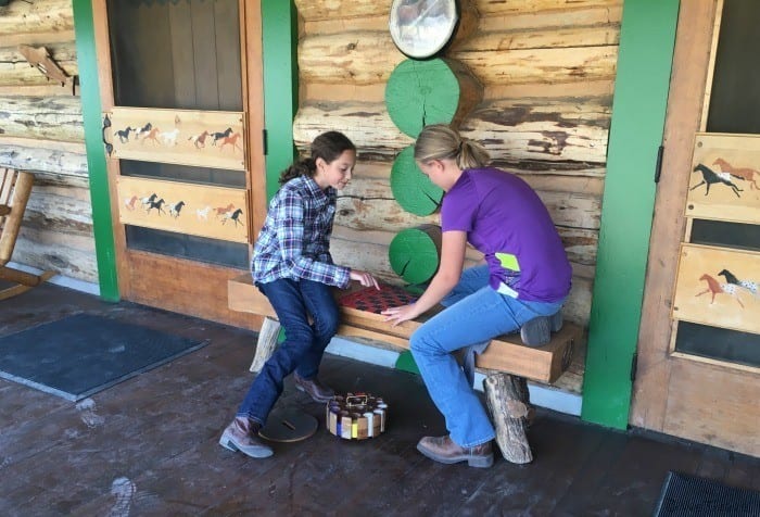 The accommodations were rustic and we were situated in a two-room log cabin. The main room was the master bedroom, with a queen bed, so there wasn’t a lot of space just for hanging out inside, but there was a nice porch and plenty of space at the lodge. The second bedroom had bunk beds and was perfect for Hannah and her friend.